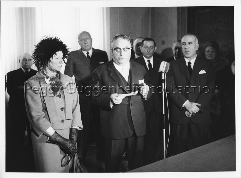 Peggy Guggenheim mentre ascolta il discorso pronunciato dal sindaco di Venezia Giovanni Favaretto Fisca il giorno in cui le fu conferita la cittadinanza onoraria, il 5 febbraio 1962.