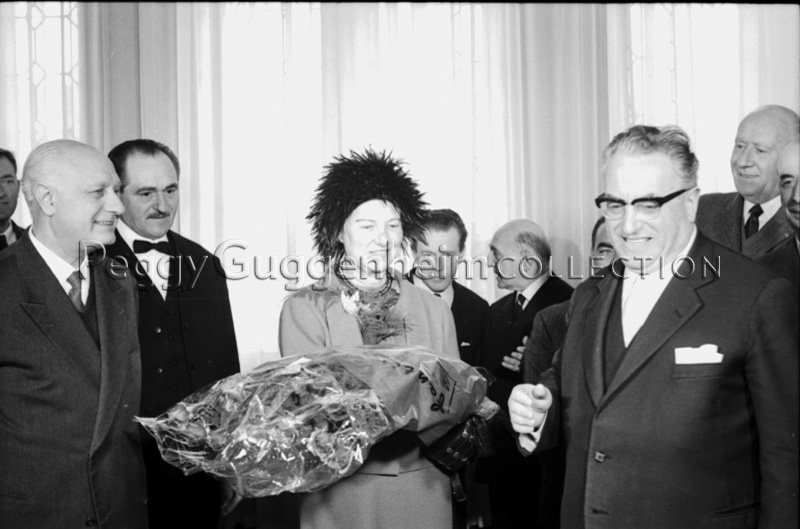 L'immagine ritrae Peggy Guggenheim mentre riceve un mazzo di fiori dal sindaco di Venezia Giovanni Favaretto Fisca durante giorno in cui le fu concessa la cittadinanza onoraria, il 5 febbraio 1962 in Municipio a Venezia.