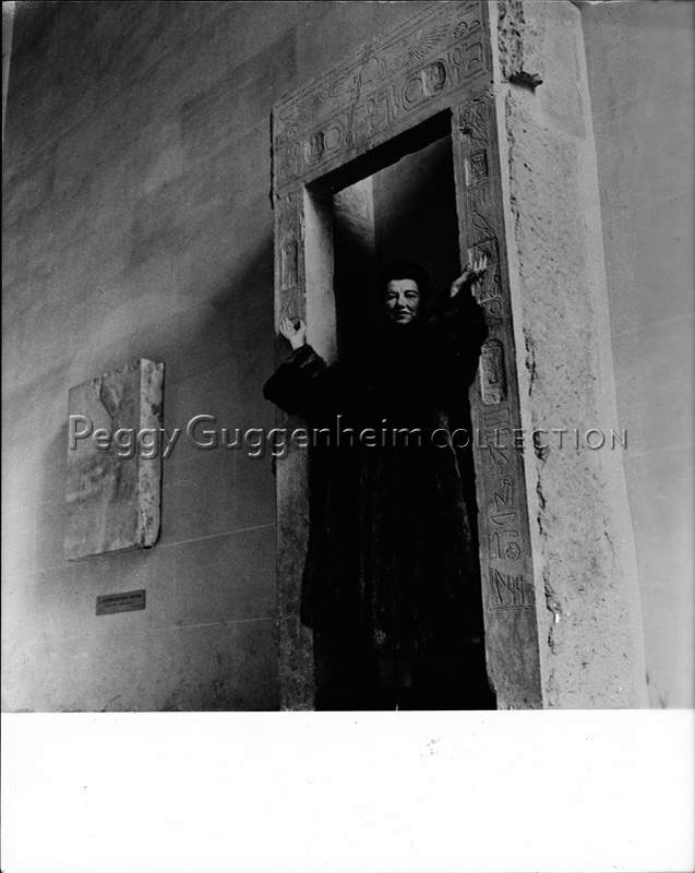 Peggy Guggenheim, in posa nella cornice di un portale decorato da bassorilievi egizi, esposto al Museo del Louvre. Anni '50.