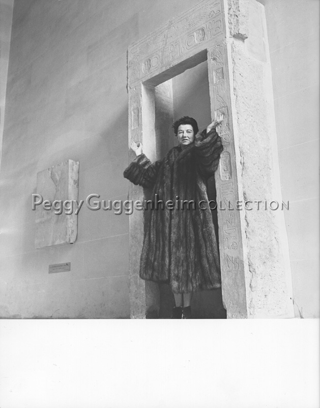 Peggy Guggenheim, in posa nella cornice di un portale decorato da bassorilievi egizi, esposto al Museo del Louvre. Anni '50.