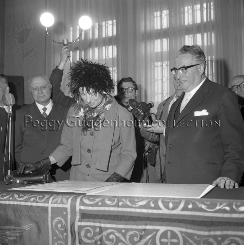 Peggy Guggenheim mentre ascolta il discorso pronunciato dal sindaco di Venezia Giovanni Favaretto Fisca il giorno in cui le fu conferita la cittadinanza onoraria, il 5 febbraio 1962.