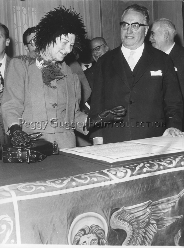 Peggy Guggenheim e il sindaco di Venezia Giovanni Favaretto Fisca durante giorno in cui le fu conferita la cittadinanza onoraria, il 5 febbraio 1962 in Municipio a Venezia.