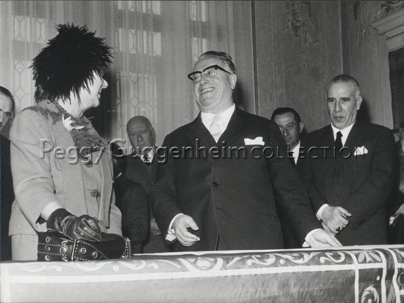 Peggy Guggenheim e il sindaco di Venezia Giovanni Favaretto Fisca il giorno in cui le fu conferita la cittadinanza onoraria, il 5 febbraio 1962 al Municipio di Venezia.