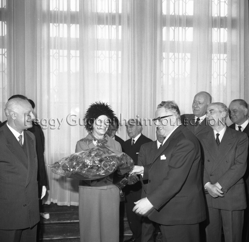 L'immagine ritrae Peggy Guggenheim mentre riceve un mazzo di fiori dal sindaco di Venezia Giovanni Favaretto Fisca durante giorno in cui le fu concessa la cittadinanza onoraria, il 5 febbraio 1962 in Municipio a Venezia.