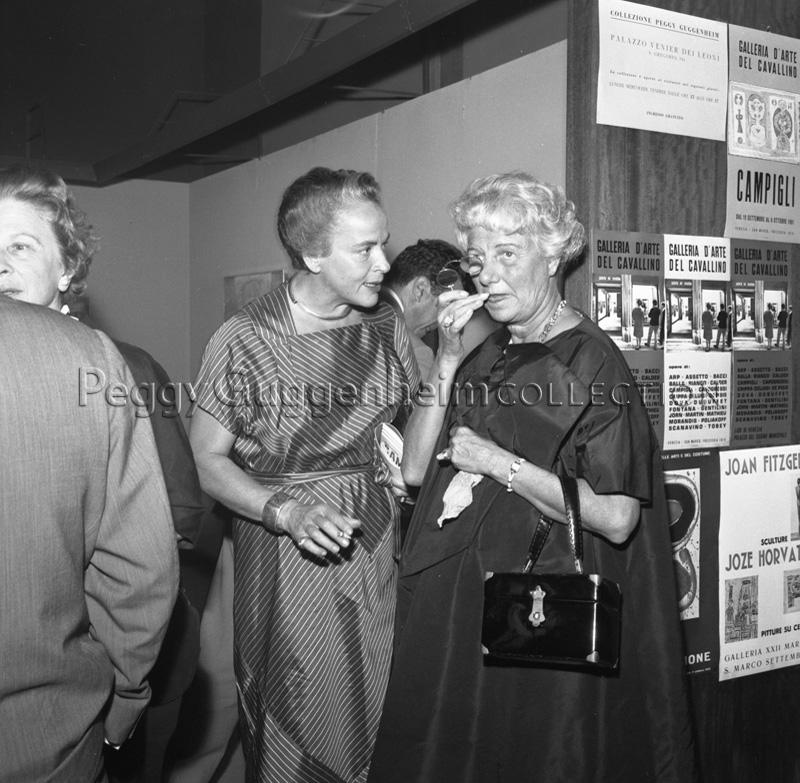 Peggy Guggenheim con degli occhiali in mano all'ingresso della Galleria del Cavallino in compagnia di Giuditta Scalini, moglie di Massimo Campigli. Si notano vari manifesti degli artisti che esposero alla galleria d'arte.