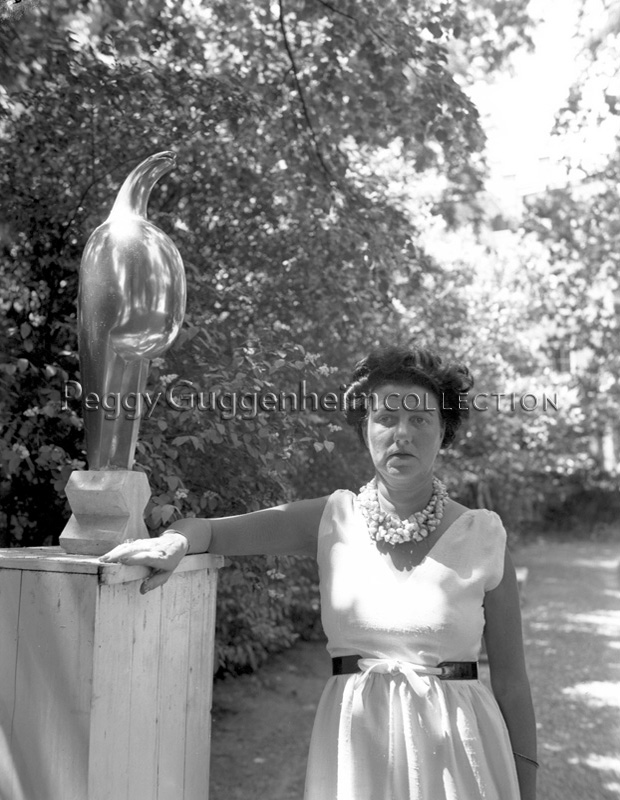L'immagine ritrae Peggy Guggenheim nel giardino di Palazzo Venier dei Leoni accanto all'opera di Constantin Brancusi "Maiastra" (1912, Peggy Guggenheim Collection). Peggy indossa un abito bianco e una collana di conchiglie.