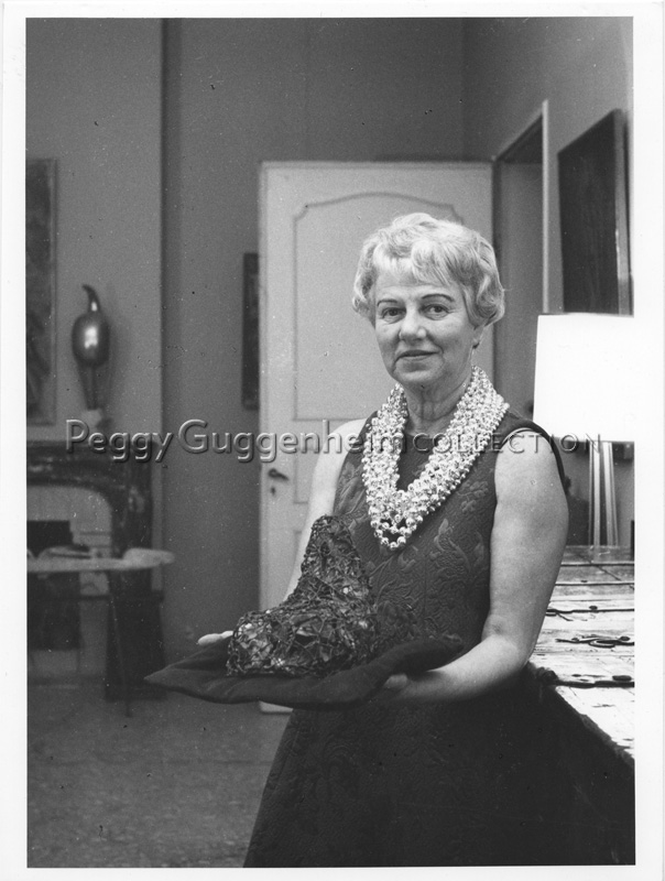 La foto ritrae Peggy Guggenheim nel salone di Palazzo Venier dei Leoni con in mano l'opera di Claire Falkenstein "Corno dogale" (datazione e destinazione ignote). In fondo alla stanza a sinistra si può vedere l'opera di Constantin Brancusi "Maiastra" (1912, Peggy Guggenheim Collection).