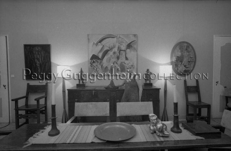 In primo piano, sul tavolo, compare l'opera di Jean Arp "Testa e conchiglia" (1933, Peggy Guggenheim Collection), mentre sulla parete di fondo si alternano da sinistra: Marcel Duchamp "Nudo (studio). Giovane triste in treno" (1911-12), Peggy Guggenheim Collection), Vassily Kandinsky "Paesaggio con macchie rosse n.2" (1913, Peggy Guggenheim Collection) e Georges Braque "Il clarinetto" (1912, Peggy Guggenheim Collection). Sopra il mobile a cui si appoggia Peggy ci sono invece "Figura maschile" e "Figura femminile", due delle sculture dalle Americhe della Collezione Peggy Guggenheim e l'opera di Claire Falkenstein "Corno dogale" (datazione e destinazione ignote).
