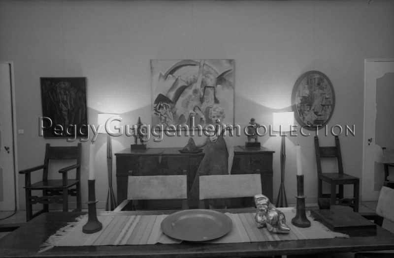 In primo piano, sul tavolo, compare l'opera di Jean Arp "Testa e conchiglia" (1933, Peggy Guggenheim Collection), mentre sulla parete di fondo si alternano da sinistra: Marcel Duchamp "Nudo (studio). Giovane triste in treno" (1911-12), Peggy Guggenheim Collection), Vassily Kandinsky "Paesaggio con macchie rosse n.2" (1913, Peggy Guggenheim Collection) e Georges Braque "Il clarinetto" (1912, Peggy Guggenheim Collection). Sopra il mobile a cui si appoggia Peggy ci sono invece "Figura maschile" e "Figura femminile", due delle sculture dalle Americhe della Collezione Peggy Guggenheim e l'opera di Claire Falkenstein "Corno dogale" (datazione e destinazione ignote).