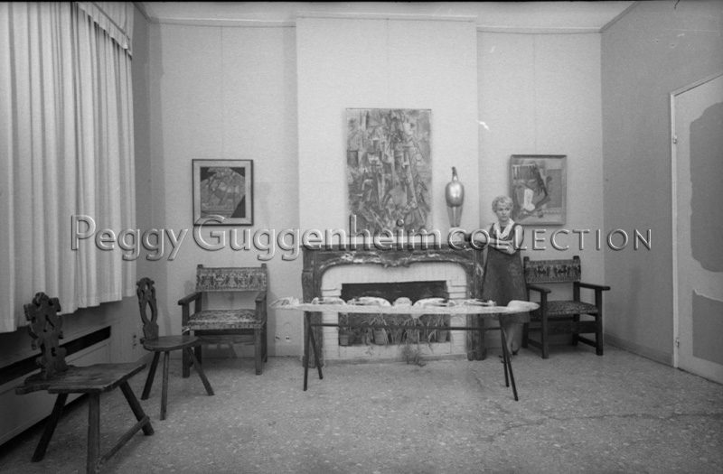 L'immagine ritrae Peggy Guggenheim a Palazzo Venier dei Leoni in piedi accanto all'opera di Constantin Brancusi "Maiastra" (1912, Peggy Guggenheim Collection) poggiata sul camino. In primo piano posizionata su di un cavalletto vediamo "Intaglio funerario" della collezione di Sculture dall'Oceania. Appese al muro da sinistra: Juan Gris "Bottiglia di rum e giornale" (1914, Peggy Guggenheim Collection), Pablo Picasso "Il poeta" (1911, Peggy Guggenheim Collection), Pablo Picasso "Pipa, bicchiere, bottiglia di Vieux Marc" (1914, Peggy Guggenheim Collection).