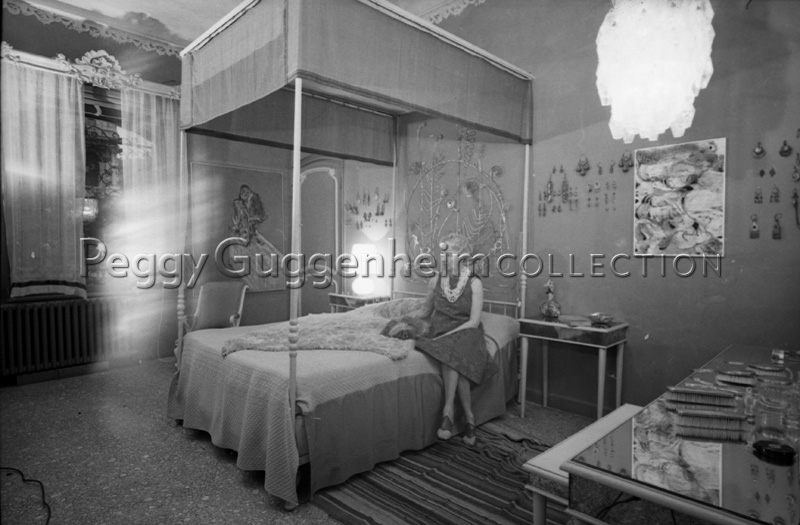 L'immagine riprende Peggy Guggenheim seduta sul suo letto a Palazzo Venier dei Leoni, accanto a lei uno dei suoi amati cani di razza Lasha Apsos Terrier. Si possono vedere le opere di Francis Bacon "Studio per scimpanzè" (1957, Peggy Guggenheim Collection) e di Alexander Calder "Testiera del letto in argento" (1945-46, Peggy Guggenheim Collection). Sul tavolino accanto a Peggy compare inoltre un "Bottiglia incrostata" di Laurence Vail (datazione e destinazione ignote). Alle pareti della stanza sono appesi molti degli orecchini collezionati dalla signora Guggenheim.