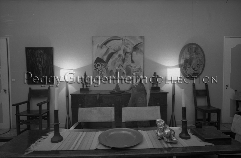 In primo piano, sul tavolo, compare l'opera di Jean Arp "Testa e conchiglia" (1933, Peggy Guggenheim Collection), mentre sulla parete di fondo si alternano da sinistra: Marcel Duchamp "Nudo (studio). Giovane triste in treno" (1911-12), Peggy Guggenheim Collection), Vassily Kandinsky "Paesaggio con macchie rosse n.2" (1913, Peggy Guggenheim Collection) e Georges Braque "Il clarinetto" (1912, Peggy Guggenheim Collection). Sopra il mobile a cui si appoggia Peggy ci sono invece "Figura maschile" e "Figura femminile", due delle sculture dalle Americhe della Collezione Peggy Guggenheim e l'opera di Claire Falkenstein "Corno dogale" (datazione e destinazione ignote).