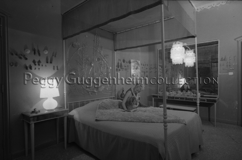 L'immagine riprende Peggy Guggenheim seduta sul suo letto a Palazzo Venier dei Leoni, accanto a lei uno dei suoi amati cani di razza Lasha Apsos Terrier. Si possono vedere le opere di Francis Bacon "Studio per scimpanzè" (1957, Peggy Guggenheim Collection) e di Alexander Calder "Testiera del letto in argento" (1945-46, Peggy Guggenheim Collection). Sul tavolino accanto a Peggy compare inoltre un "Bottiglia incrostata" di Laurence Vail (datazione e destinazione ignote). Alle pareti della stanza sono appesi molti degli orecchini collezionati dalla signora Guggenheim.
