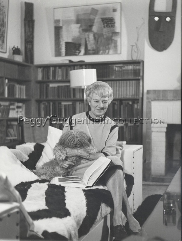 Peggy Guggenheim nella biblioteca di Palazzo Venier dei Leoni mentre indossa un abito in maglia chiaro con bordi scuri. Accanto a lei alcuni dei suoi cani Lhasa Apsos Terrier. Sullo sfondo, appesi al muro, sono riconoscibili i quadri di Tancredi, "Senza Titolo" (1953) e "Trasparenze degli elementi" (1957), oltre a "Maschera" della collezione delle sculture d'Africa.