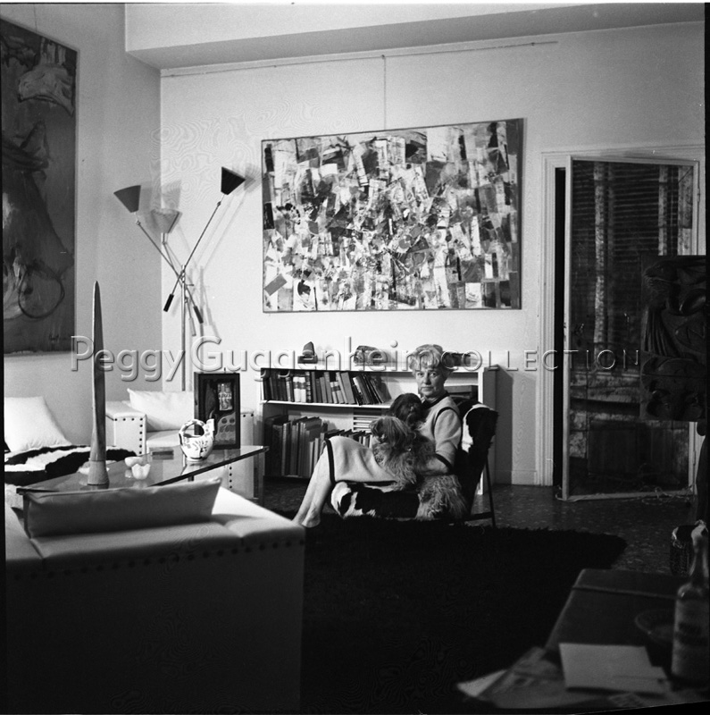 Servizio fotografico: Peggy Guggenheim con vestito con bordi scuri a Palazzo Venier