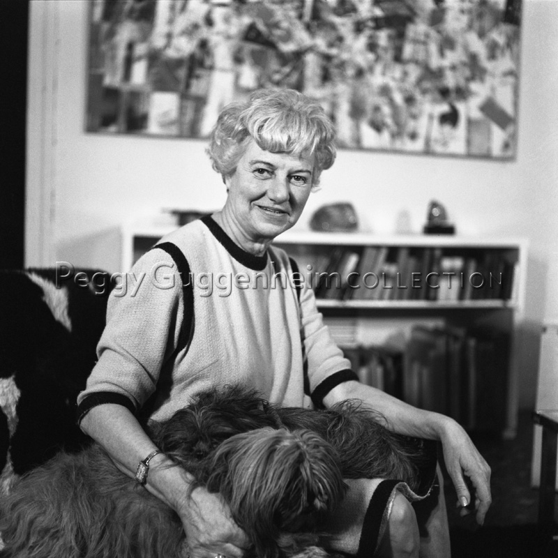Servizio fotografico: Peggy Guggenheim con vestito con bordi scuri a Palazzo Venier