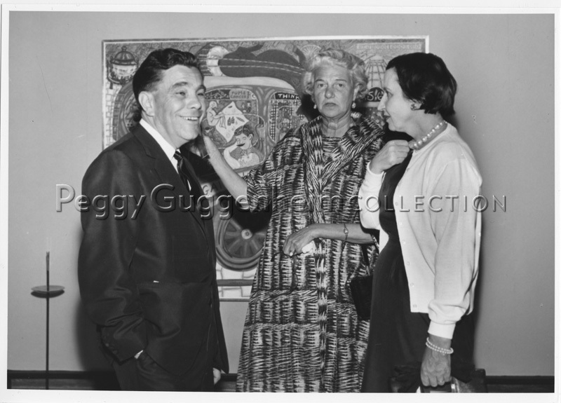 Peggy Guggenheim con William Copley e una donna alla personale dell'artista tenutasi alla Galleria del Cavallino di Venezia nel 1960. Alle loro spalle si può ammirare una delle opere esposte