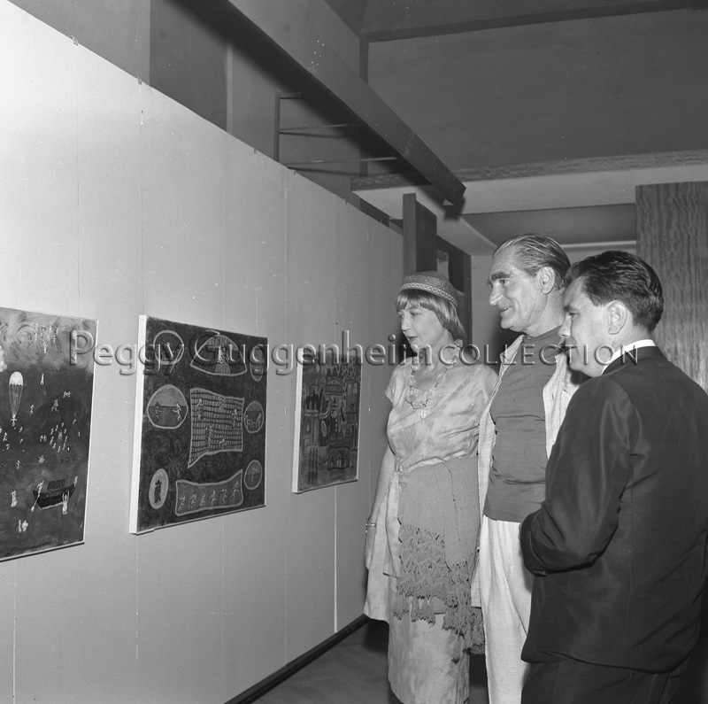 William Copley in compagnia di due visitatori nel 1960 durante l'inaugurazione della sua personale alla Galleria del Cavallino (Venezia). Lungo la parete della stanza si possono notare alcune delle opere in mostra.