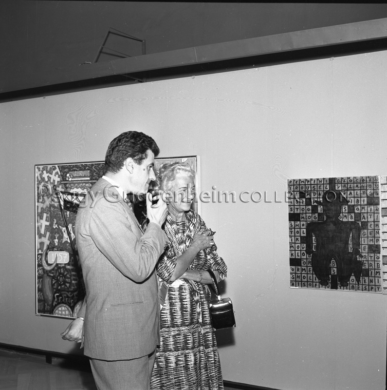 Peggy Guggenheim sorridente davanti una delle opere di William Copley esposte alla mostra personale presso la Galleria del Cavallino nel 1960. Con lei il gallerista Renato Cardazzo
