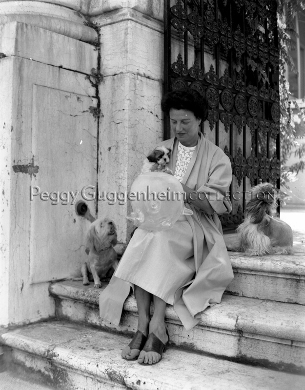 L'immagine ritrae Peggy Guggenheim nel giardino di Palazzo Venier dei Leoni, seduta accanto ad alcuni dei suoi cani, mentre regge in grembo una scultura in vetro di Vinicio Vianello, "Esplorazione a Las Svegas".