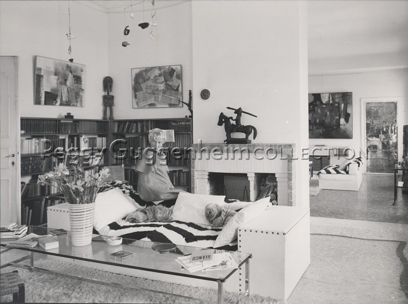 Peggy Guggenheim seduta sulla spalliera del divano della biblioteca, a Palazzo Venier dei Leoni, indossa un mantello chiaro. Alle sue spalle, sopra il caminetto, è riconoscibile una delle sculture della sua collezione di arte etnica, "Cavallo e cavaliere", sopra il caminetto. Sulla parete a sinistra, il quadro di Tancredi, "Senza Titolo" (1953).