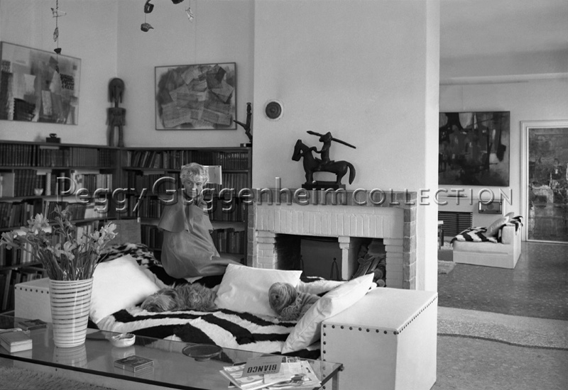 Peggy Guggenheim seduta sulla spalliera del divano della biblioteca, a Palazzo Venier dei Leoni, indossa un mantello chiaro. Alle sue spalle, sopra il caminetto, è riconoscibile una delle sculture della sua collezione di arte etnica, "Cavallo e cavaliere", sopra il caminetto. Sulla parete a sinistra, il quadro di Tancredi, "Senza Titolo" (1953).