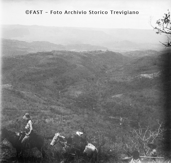Raimondo Franchetti e seguito, accompagnato da indigeni con fucile a spalla sale fra le sterpaglie affianco al suo cavallo i monti etiopi.