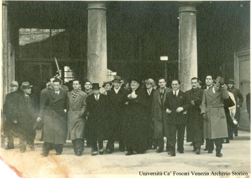 Venezia, cortile di Ca' Foscari. Gruppo di studenti e docenti dell'Istituto Universitario di Economia e Commercio (IUEC, oggi Università Ca' Foscari Venezia) accompagnati dal cardinale Adeodato Giovanni Piazza, Patriarca di Venezia e dal prorettore Agostino Lanzillo.