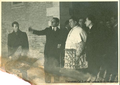 Venezia, interno di Ca' Foscari. Ripresa del prorettore Agostino Lanzillo nell'atto d'illustrare qualcosa al cardinale Adoedato Giovanni Piazza, Patriarca di Venezia ed al gruppo di studenti e docenti dell'Istituto Universitario di Economia e Commercio (IUEC) che lo circonda.