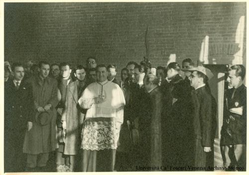 Venezia, sala al primo piano di Ca' Foscari. Il cardinale Adeodato Giovanni Piazza, Patriarca di Venezia insieme con, alla sua sinistra, il prorettore Agostino Lanzillo, sono circondati da un gruppo di studenti e docenti dell'Istituto Universitario di Economia e Commercio (IUEC, oggi Università Ca' Foscari Venezia).