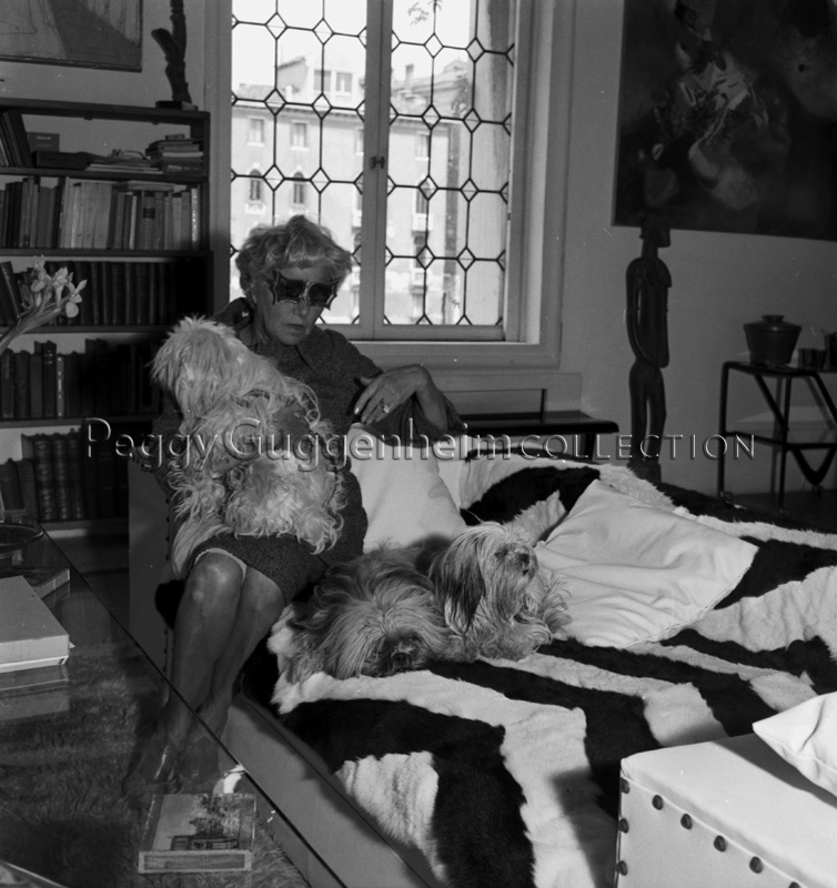 La foto ritrae Peggy Guggenheim a Palazzo Venier dei Leoni con indosso gli occhiali a forma di farfalla disegnati per lei dallo scultore inglese Edward Melcarth. Sul divano zebrato della stanza sono accucciati tre dei suoi amati Lhasa Apsos Terriers. Alla parete vediamo appesa la tela di Edmondo Bacci "Avvenimento #247" (1956, Peggy Guggenheim Collection), sotto la quale è collocata la scultura africana "Figura femminile" (Peggy Guggenheim Collection, PG250a).