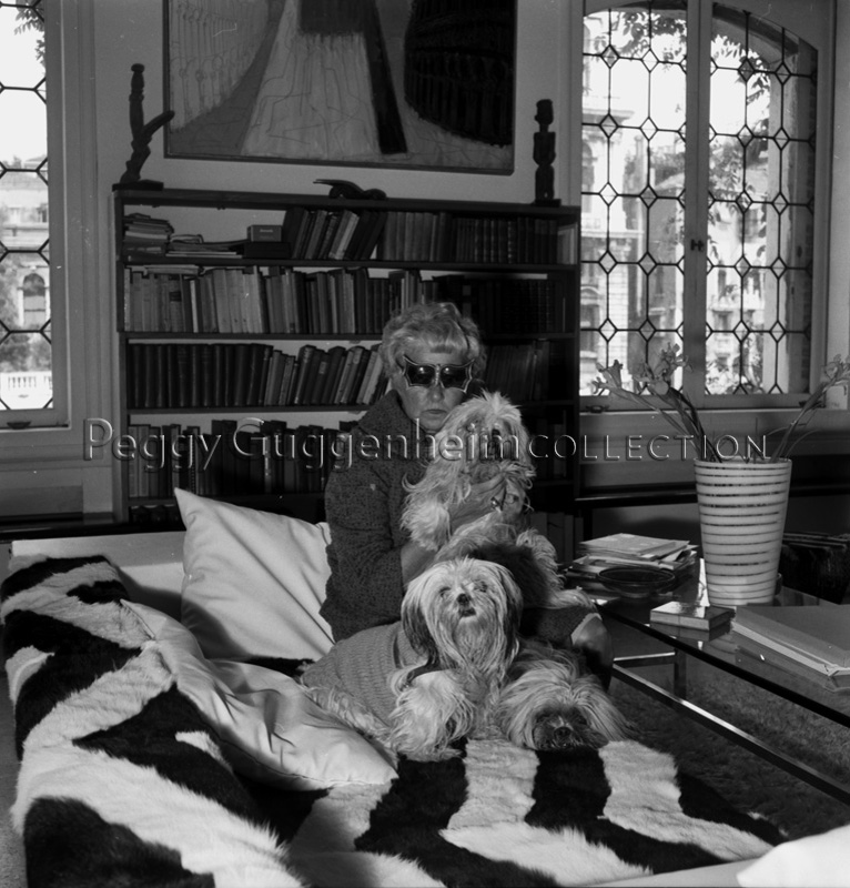 L'immagine ritrae Peggy Guggenheim nella sua biblioteca a Palazzo Venier dei Leoni. Peggy, che indossa gli occhiali a forma di farfalla creati per lei dallo scultore inglese Edward Melcarth, è seduta sul divano insieme a tre dei suoi cani di razza Lhasa Apsos Terriers. In alto a sinistra si vede in parte l'opera di William Congdon "Piazza San Marco" (1957, Peggy Guggenheim Collection). La stanza è arredata poi da due sculture facenti parte della collezione di arte primitiva di Peggy.