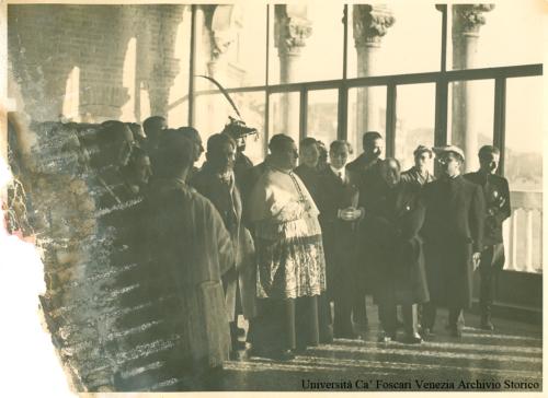 Venezia, primo piano di Palazzo Foscari. Il cardinale Adeodato Giovanni Piazza, Patriarca di Venezia, insieme con il prorettore Agostino Lanzillo, studenti e docenti dell'Istituto Universitario di Economia e Commercio (IUEC), in posa nel salone al piano nobile di Ca' Foscari.