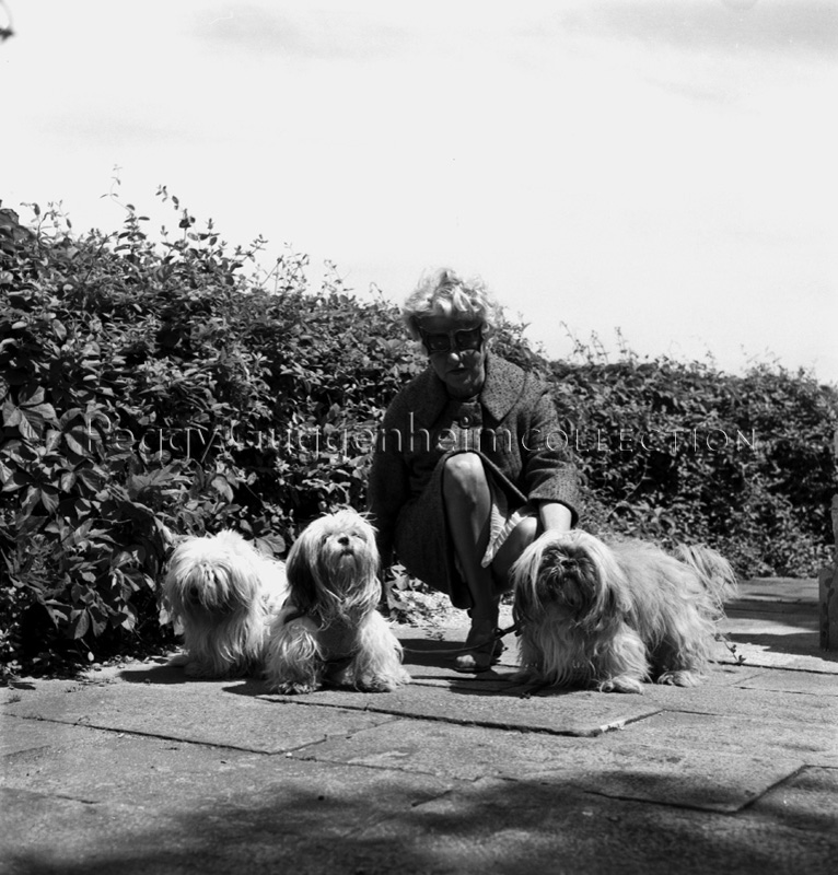 L'immagine ritrae Peggy Guggenheim nella Terrazza Marini di Palazzo Venier dei Leoni in compagnia di tre dei suoi cani di razza Lhasa Apsos Terriers. Peggy indossa i famosi occhiali a forma di farfalla creati per lei dallo scultore inglese Edward Melcarth.