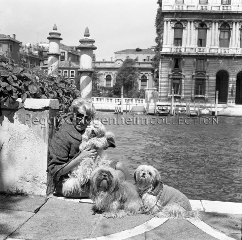 L'immagine ritrae Peggy Guggenhem nella terrazza di Palazzo Venier dei Leoni che dà accesso diretto al Canal Grande. Peggy indossa gli occhiali a forma di farfalla creati per lei dallo scultore inglese Edward Melcarth ed è circondata dai suoi amati Lhasa Apsos Terriers. In lontananza si vede il ponte dell'Accademia.