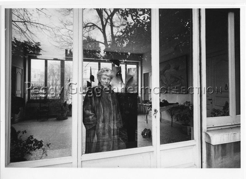 L'immagine ritrae Peggy Guggenheim, con una pelliccia indosso, mentre guarda oltre la porta a vetri che si affaccia sul giardino di Palazzo Venier dei Leoni. Dai vetri si possono vedere le opere di Alexander Calder "Arco di petali" (1941, Peggy Guggenheim Collection), Antoine Pevsner "Superficie sviluppabile" (1941, Peggy Guggenheim Collection) e Pablo Picasso "Sulla spiaggia" (1937, Peggy Guggenheim Collection)