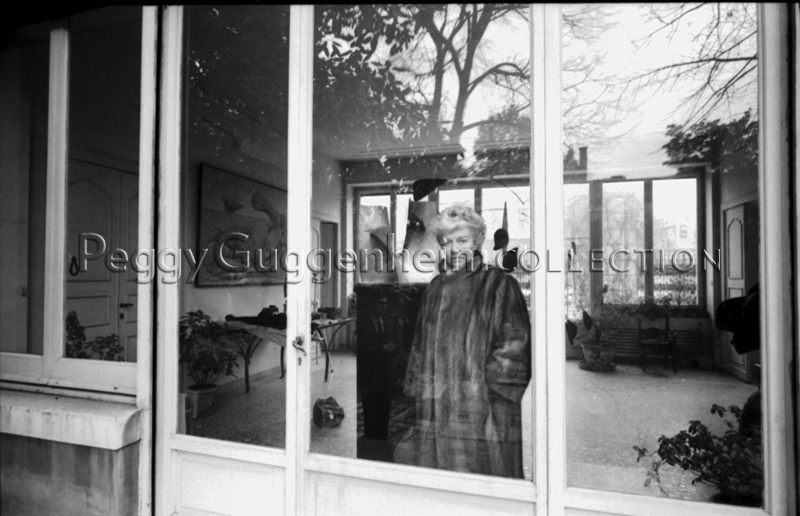 L'immagine ritrae Peggy Guggenheim, con una pelliccia indosso, mentre guarda oltre la porta a vetri che si affaccia sul giardino di Palazzo Venier dei Leoni. Dai vetri si possono vedere le opere di Alexander Calder "Arco di petali" (1941, Peggy Guggenheim Collection), Antoine Pevsner "Superficie sviluppabile" (1941, Peggy Guggenheim Collection) e Pablo Picasso "Sulla spiaggia" (1937, Peggy Guggenheim Collection)