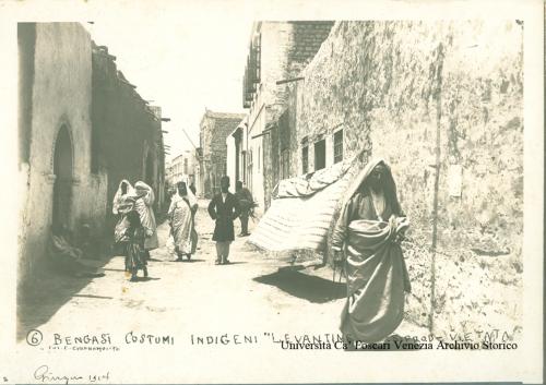 Libia, Bengasi. Donne velate e nativi con i loro costumi passeggiano in una via soleggiata della città. Sulla cornice di un arco acuto che si apre a sinistra si legge: "Panetteria italiana(...)"