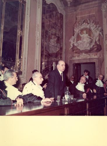 Venezia: Ca' Dolfin, Aula Magna. Ripresa della cattedra dei docenti con, al centro, il rettore Italo Siciliano. Probabilmente si tratta della cerimonia d'inaugurazione di un anno accademico dell'Istituto Universitario di Economia e Commercio e di Lingue e Letterature Straniere (oggi Università Ca' Foscari Venezia).