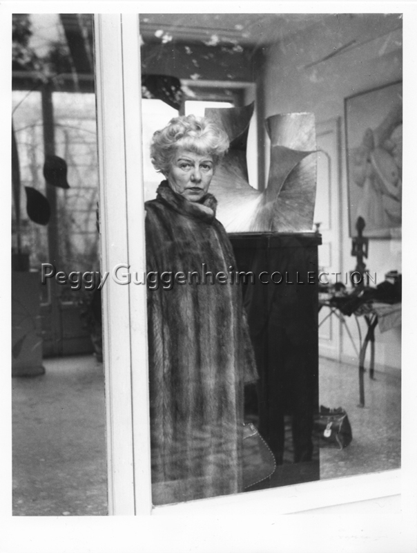 Peggy Guggenheim dietro la porta a vetri dell'ingresso di Palazzo Venier dei Leoni. Peggy indossa una pelliccia e ha in mano una borsa di pelle. Alle sue spalle si erge su di un piedistallo l'opera di Antoine Pevsner "Superficie sviluppabile" (1941, Peggy Guggenheim Collection). Alla sinistra dell'immagine si vede in parte l'opera di Alexander Calder "Arco di Petali" (1941, Peggy Guggenheim Collection), dietro la quale si scorge "Uccello nello spazio" di Constantine Brancusi (1932-40, Peggy Guggenheim Collection). Alla destra della foto si vede invece un tavolino sopra il quale è posata l'opera facente parte della collezione di Sculture dall'Africa "Figura seduta" (Peggy Guggenheim Collection, PG241). In alto a destra si può notare in fine l'opera di Pablo Picasso "Sulla spiaggia" (1937, Peggy Guggenheim Collection).