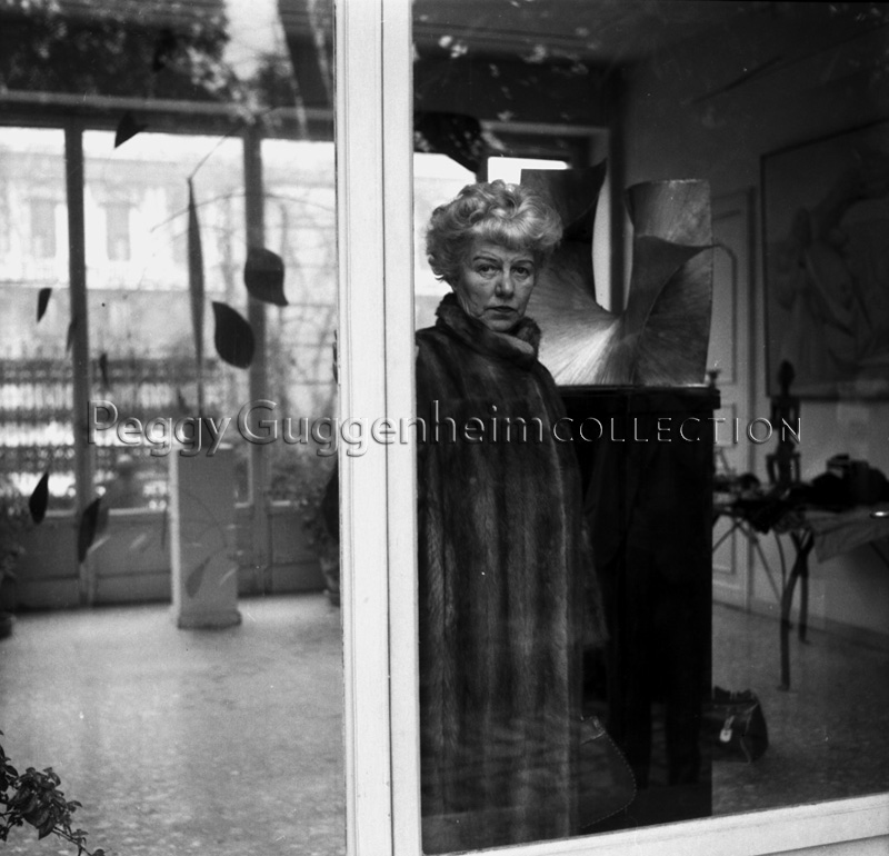 Peggy Guggenheim dietro la porta a vetri dell'ingresso di Palazzo Venier dei Leoni. Peggy indossa una pelliccia e ha in mano una borsa di pelle. Alle sue spalle si erge su di un piedistallo l'opera di Antoine Pevsner "Superficie sviluppabile" (1941, Peggy Guggenheim Collection). Alla sinistra dell'immagine si vede in parte l'opera di Alexander Calder "Arco di Petali" (1941, Peggy Guggenheim Collection), dietro la quale si scorge "Uccello nello spazio" di Constantine Brancusi (1932-40, Peggy Guggenheim Collection). Alla destra della foto si vede invece un tavolino sopra il quale è posata l'opera facente parte della collezione di Sculture dall'Africa "Figura seduta" (Peggy Guggenheim Collection, PG241). In alto a destra si può notare in fine l'opera di Pablo Picasso "Sulla spiaggia" (1937, Peggy Guggenheim Collection).