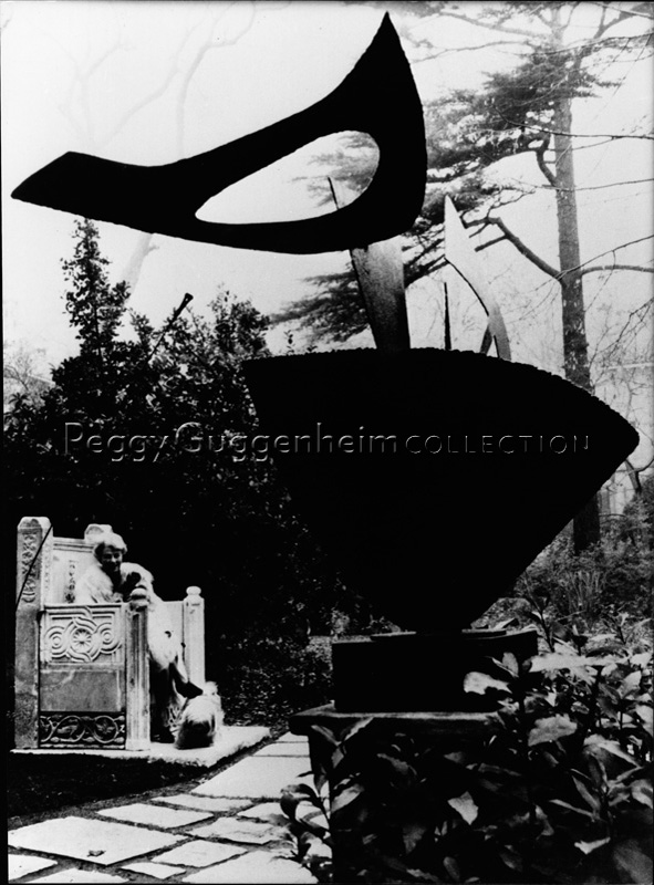 Peggy Guggenheim in pelliccia chiara, seduta sul cd. trono bizantino, nel giardino di Palazzo Venier dei Leoni, anni '60. In primo piano una scultura di destino ignoto.