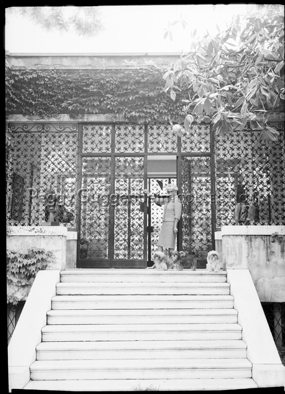 Peggy Guggenheim davanti all'ingresso di Palazzo Venier dei Leoni. Peggy indossa gli occhiali a forma di farfalla creati per lei da Edward Melcarth, attorno a lei sono tre dei suoi cani Lhasa Apsos Terrier.