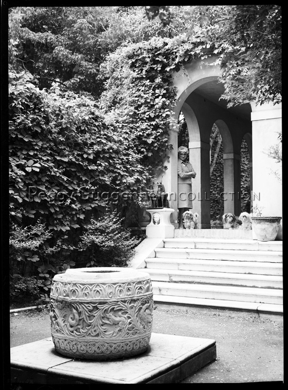 Peggy Guggenheim davanti all'ingresso della barchessa di Palazzo Venier dei Leoni. Peggy indossa gli occhiali a forma di farfalla creati per lei da Edward Melcarth, attorno a lei sono tre dei suoi cani Lhasa Apsos Terrier.
