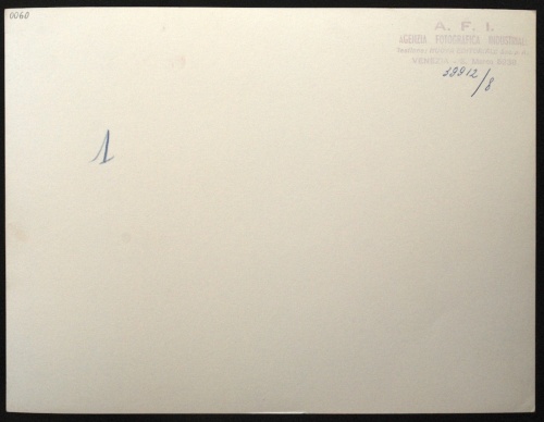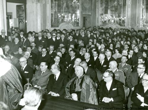 Venezia: Ca' Dolfin, Aula Magna. Seduto in prima fila, in platea, si riconosce Giovanni Urbani, Patriarca di Venezia. Si tratta, probabilmente, dell'inaugurazione di un anno accademico dell'Istituto Universitario di Economia e Commercio e di Lingue e Letterature Straniere (oggi Università Ca' Foscari Venezia) officiata dal rettore Italo Siciliano.