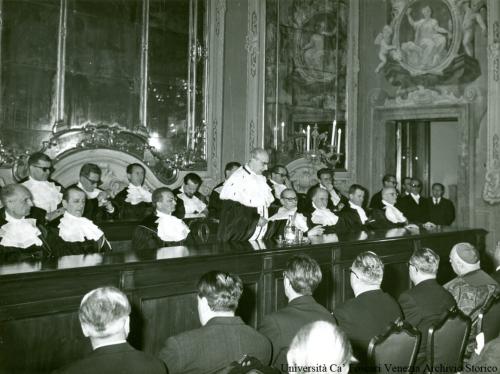 Venezia: Ca' Dolfin, Aula Magna. Il rettore Italo Siciliano in piedi, alla cattedra, legge rivolto al pubblico, circondato da docenti dell'Istituto Universitario di Economia e Commercio e di Lingue e Letterature Straniere (oggi Università Ca' Foscari Venezia) seduti e distribuiti su due file. Si tratta, probabilmente, della cerimonia d'inaugurazione di un anno accademico.