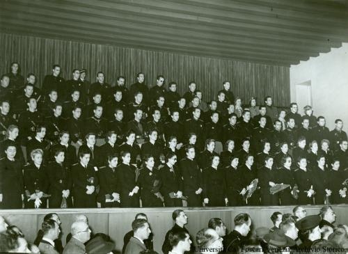 Venezia, Ca' Foscari: Aula Magna o Aula degli Atti Accademici, oggi Aula Baratto. In piedi, nella tribuna, sono presenti giovani in divisa e con la feluca per l'inaugurazione dell'Anno Accademico 1939-1940 dell'Istituto Universitario di Economia e Commercio (IUEC).