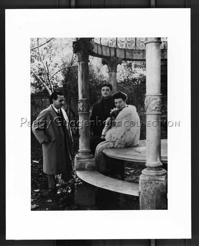 Peggy Guggenheim con Tancredi ed Edmondo Bacci nel giardino di Palazzo Venier dei Leoni, primi anni '50.