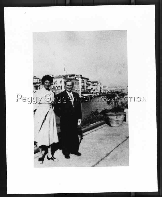 Peggy Guggenheim e Joan Mirò sulla roof terrace di Palazzo Venier dei Leoni, posano sullo sfondo del Canal Grande, anni '50.