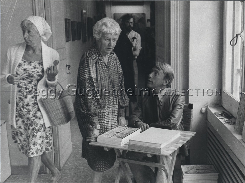 Peggy Guggenheim accanto a John Hohnsbeen (studioso, storico dell'arte, segretario di Peggy negli anni '70) seduto al tavolo dei cataloghi durante un'esposizione a Palazzo Venier dei Leoni, fine anni '70.